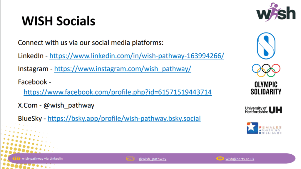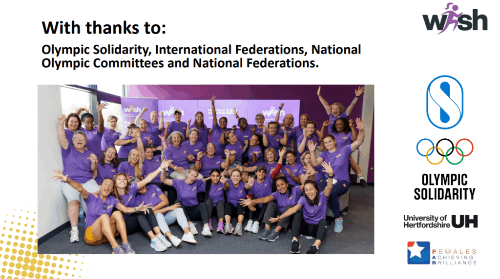 Funded by Olympic Solidarity, WISH was created to help meet the IOC Gender Equality Objective 15βto increase the presence of women coaches at the Olympic Games and World Championships. Since its inception, 125 coaches from 60 countries and 22 sports have taken part.
